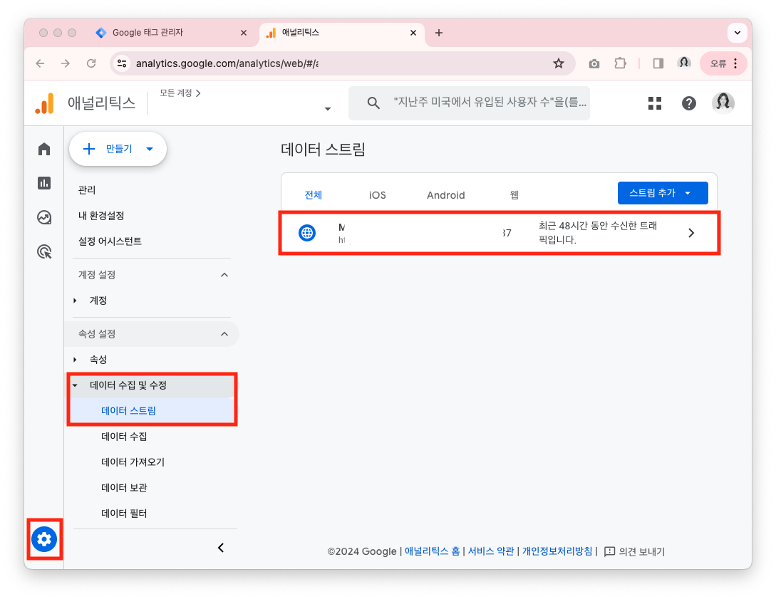 - 하단 톱니바퀴 설정 아이콘 > 속성 설정 > 데이터 수집 및 수정 > 데이터 스트림 > 해당 스트림 선택