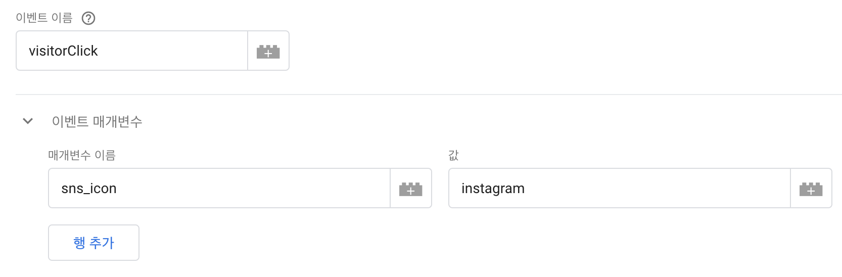 특정 페이지에서 방문자가 하는 모든 클릭 액션을 수집하는데(VisitorClick) 그 중 SNS 아이콘을 클릭한 값을 구분하고(sns_icon) 또 그 중에서도 인스타그램 아이콘(instagram)을 클릭한 액션까지 자세하게 정의해서 이벤트로 정의할 수 있다. 이렇게 정의를 하면 수집되는 데이터는 아래와 같은 구조로 확인할 수 있을 것이다.