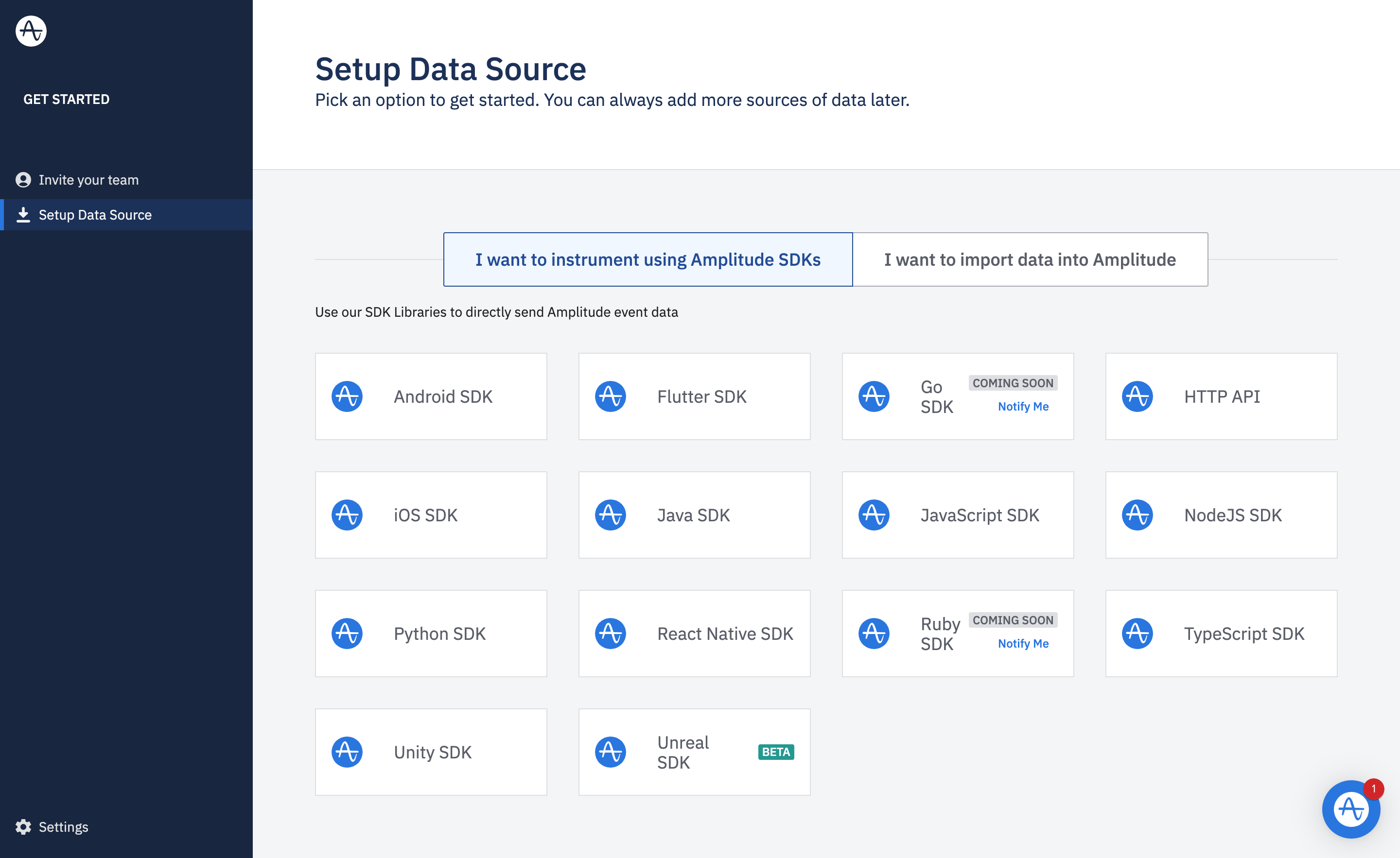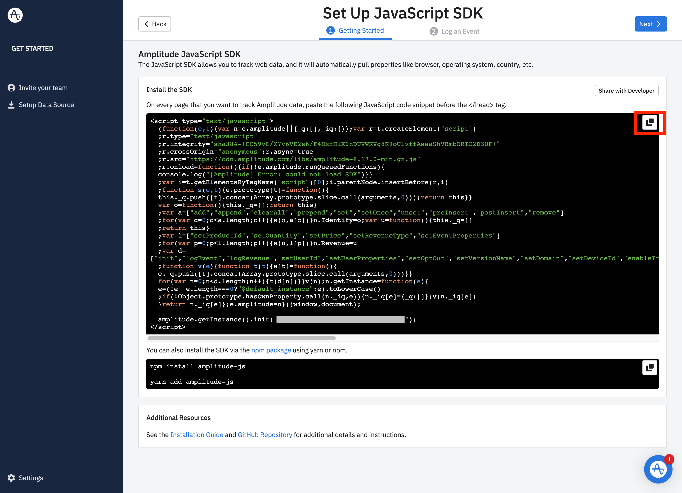 대시보드 자체는 만들어졌다. 하지만 대시보드에서 보여줄 데이터는 아직 아무 것도 없다. 따라서, 앰플리튜드의 정보를 우리 서비스에 설치해야 한다. 우리 서비스에서 앰플리튜드로 데이터를 보내기 위해 연결 다리 놔주는 작업이라고 생각하면 된다.
