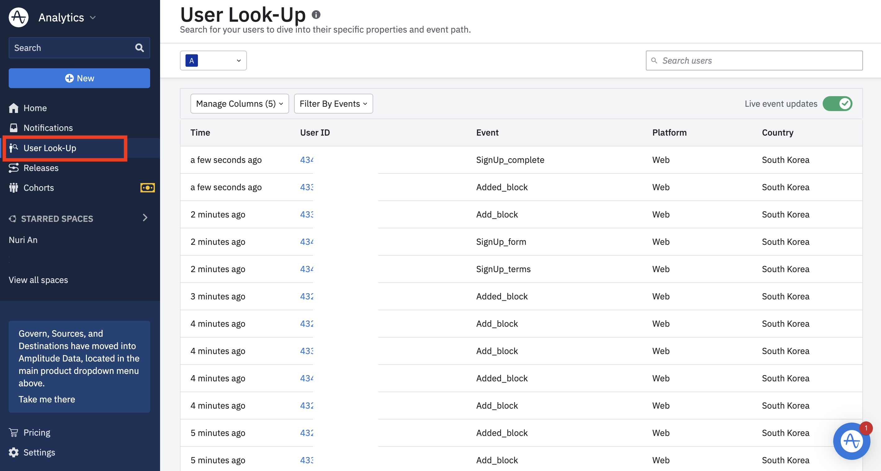 앰플리튜드 대시보드로 전송되는 데이터가 생기기 시작하면, 앰플리튜드 접속 시 위 스크린샷처럼 왼쪽 메뉴도 생기고 뭔가 대시보드스러운 화면(?)으로 변해있을 것이다. User Look-Up 메뉴를 누르면 이벤트로 정의한 유저의 이벤트가 발생할 때마다 데이터로 쌓이는 것을 확인할 수 있다.