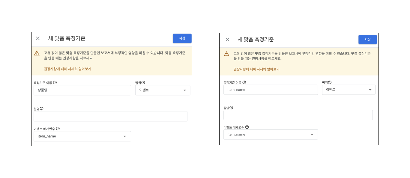 위 예시대로라면 유저가 '장바구니 추가'라는 이벤트를 할 때 '상품명'이라는 부가 정보도 같이 수집해서 보낸다는 뜻이다.